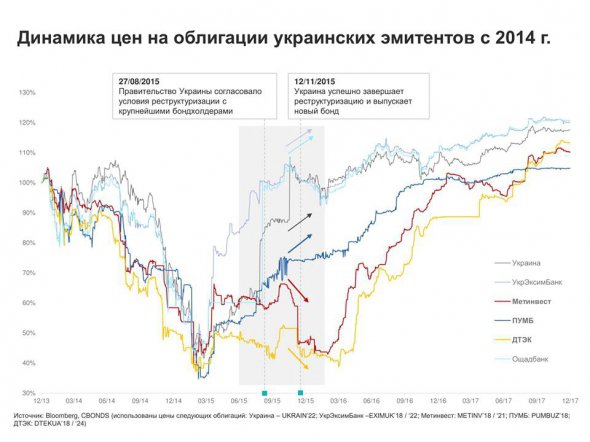 Аналогичные выводы можно сделать и из данных агентства Bloomberg. Динамика стоимости долговых бумаг всех основных промышленных эмитентов украинского рынка (Метинвест, Ferrexpo, ДТЭК, Мироновский хлебопродукт) в последние годы практически синхронна: в условиях кризиса 2014-2015 годах их стоимость опустилась до уровня 40-50% от уровня номинала, после чего в 2016-2017 годах наблюдается их существенный рост.