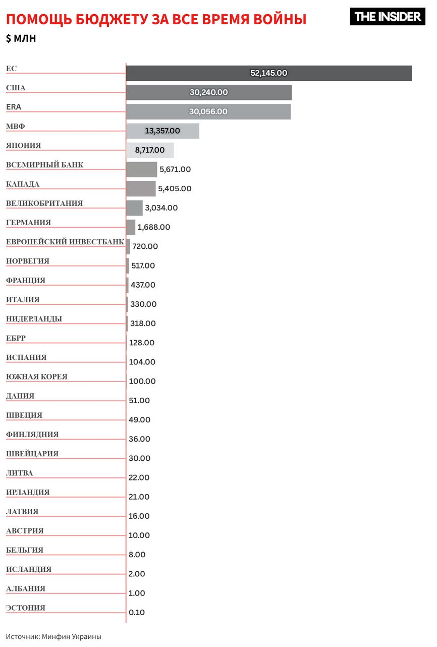 В этом году внешнего финансирования нужно чуть меньше, $39,3 млрд. И бóльшую часть из них бюджет уже получил. Теперь ERA — основной источник средств, а на втором месте программа Ukraine Facility от Евросоюза: 18,1 млрд евро обещано по ERA и 12,5 млрд евро — через Ukraine Facility. И только что, в ноябре, Урсула фон дер Ляйен заявила, что Евросоюз выделяет еще почти 6 млрд евро по кредиту ERA и Ukraine Facility. Ожидается, что остальные средства от ЕС Украина получит до конца 2025 года.